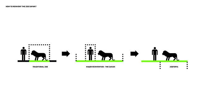 새로운 동물원의 개념은 철장 안에 가둬 두거나 차를 타고 동물의 생활 구역을 엿보는 사파리의 기존 방식을 넘어선다. 주토피아(Zootopia)는 동물원의 동물들이 보다 자유로운 환경에서 방문자와 공존한다는 개념을 적극적으로 시도한다.