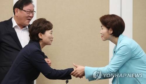 (서울=연합뉴스) 김도훈 기자 = 김현미 국토교통부장관(가운데)과 더불어민주당 한정애 제5정조위원장이 28일 오전 국회에서 열린 '사업용 차량 졸음운전 방지대책' 당정협의 시작에 앞서 인사를 하고 있다. 왼쪽은 김태년 정책위의장. 2017.7.28