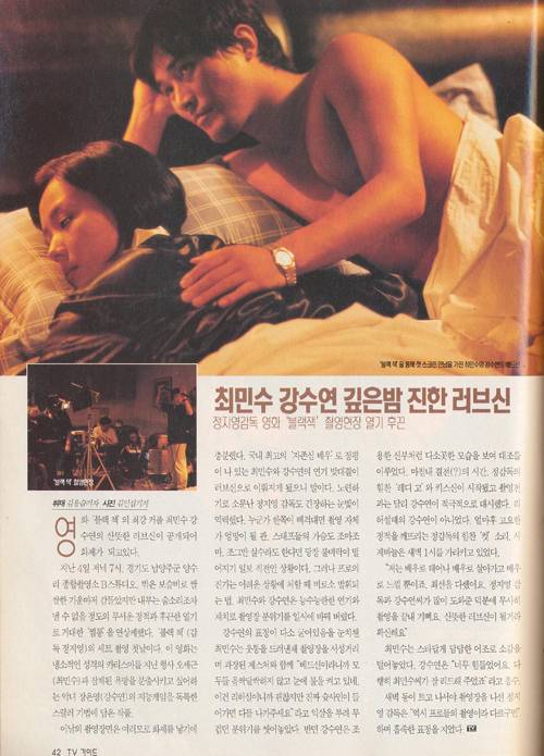 하지만 실제 촬영에서 강수연은 리허설 때와 달랐다. 최민수에 적극적으로 대시해 뜨거운 키스신을 이어갔다. 촬영이 끝나고 최민수는 "나는 배우로 태어나 배우로 살아가고 배우로 느낄 뿐이다"라면서 "정지영 감독과 강수연이 많이 도와준 덕분에 무사히 잘 끝낼 수 있어 기쁘다"고 소감을 밝혔다. 정지영 감독 역시 "프로들이라 역시 다르다"며 흡족한 표정을 지었다.]