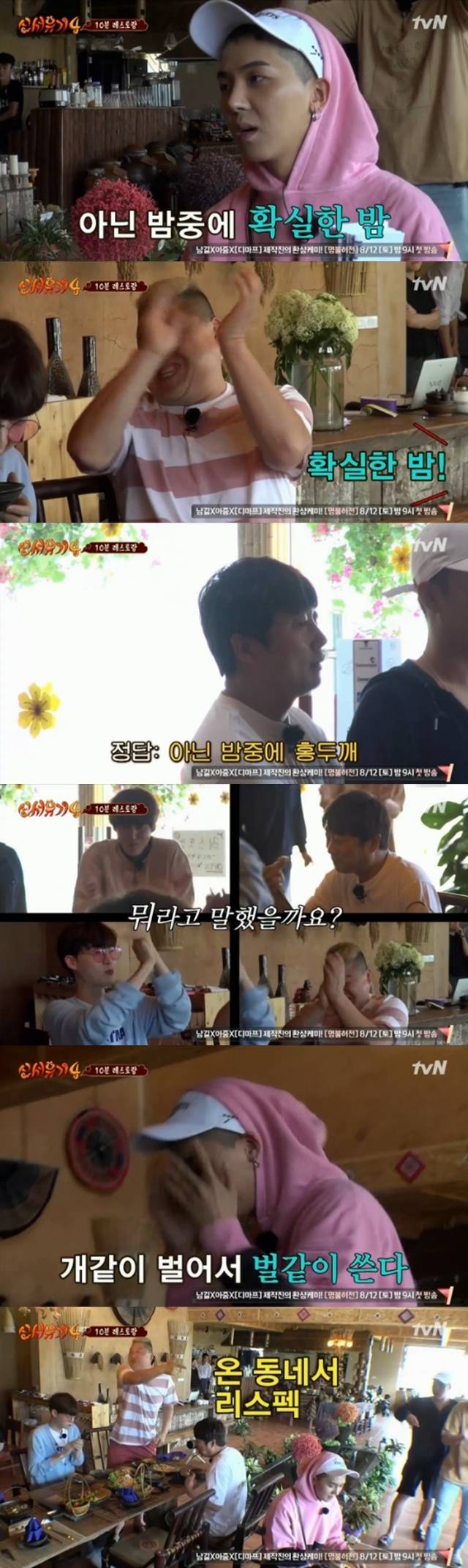 이날 송민호는 첫 문제로 속담 퀴즈를 풀게 됐다. 그는 ‘아닌 밤중에’라는 말에 ‘홍두깨’ 대신 “확실한 밤”이라 말해 폭소를 안겼다. 이에 강호동은 “리스펙트”를 외쳤다.