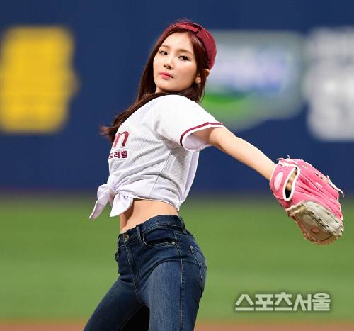 걸그룹 ‘엘리스’ 소희가 시구를 하고 있다.