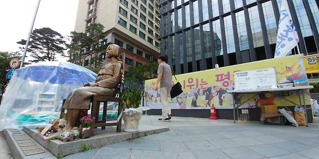 | ▲ 서울 종로구에 있는 위안부소녀상과 소녀상을 지키는 농성장 모습 |