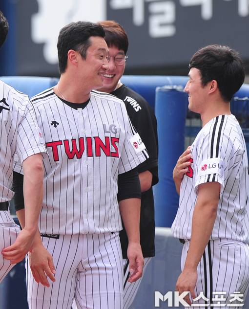 [매경닷컴 MK스포츠(잠실) = 김재현 기자] 5일 오후 잠실야구장에서 벌어진 2017 프로야구 KBO리그 두산 베어스와 LG 트윈스의 경기에서 4년 만에 1군에 등록된 여건욱이 동료들과 이야기를 나누고 있다.