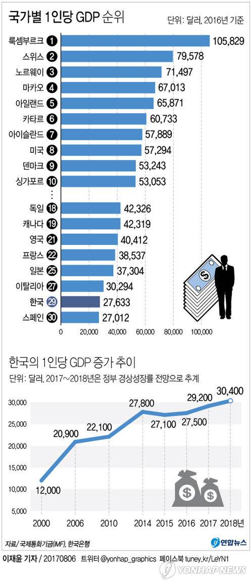 6일 국제통화기금(IMF)에 따르면 한국의 1인당 국내총생산(GDP. 2만7천633 달러) 순위가 작년 10월 기준 190여개국 가운데 29위다.