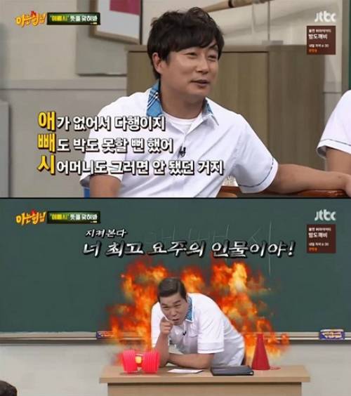| 방송인 이수근(위 사진)이 JTBC 예능 프로그램 '아는 형님'에서 축약어 '애빼시'의 뜻에 대해 답변하자 동료 서장훈이 경고하고 있다. 사진=JTBC 캡처 |