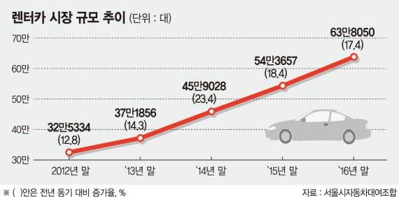 6일 서울시자동차대여조합에 따르면 전국 등록 렌터카 업체에 등록된 차량 규모는 지난 2012년 말 기준 32만5334대에서 지난해 말 63만8050대로 증가했다. 최근 4년 새 국내 렌터카 시장 규모가 220% 이상 성장한 것이다. 올해 상반기 말 기준 등록대수도 67만8065대로, 전년 말과 비교해 6% 가량 성장했다.