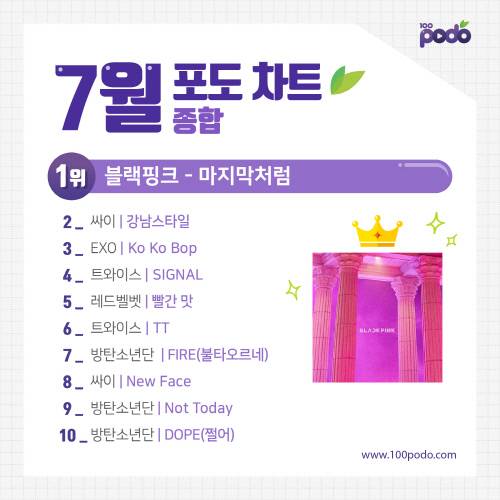 동영상 차트 플랫폼 ‘100포도닷컴’에 따르면 2017년 7월 월간 포도차트 종합부문 1위는 블랙핑크의 ‘마지막처럼’이 차지했다.