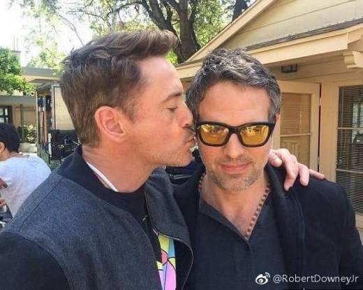 사진에서 로버트 다우니 주니어는 마크 러팔로의 어깨에 팔을 올리고 볼에 뽀뽀를 하려는 포즈를 취해 끈끈한 우정을 과시했다.