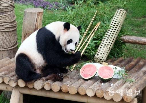 | 에버랜드에서 살고 있는 수컷 판다 러바오가 지난달 12일 초복을 맞아 수박으로 보양을 하고 있는 장면. 용인=최혁중 기자 ajinman@donga.com |