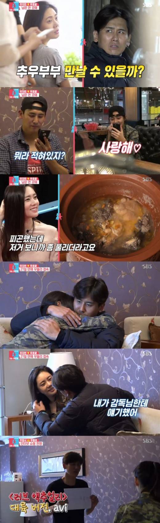 추자현은 식사 후 잠시 누웠고, 그사이 우효광이 나타났다. 추자현은 우효광의 품에 안겨 눈물을 쏟았다. 아내가 왔기 때문에 우효광의 촬영은 취소됐다고. 우효광과 추자현은 기쁨의 댄스를 춰 웃음을 자아냈다.