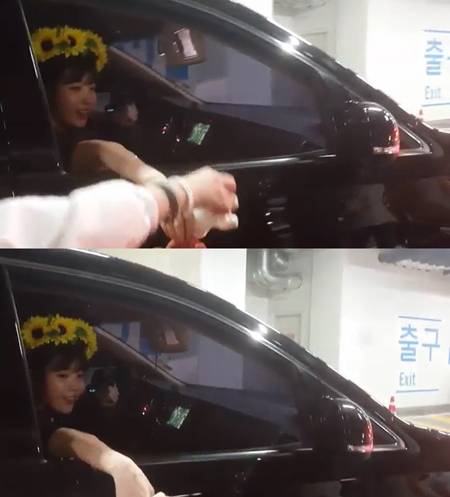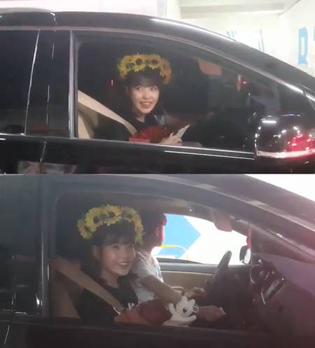 그러자 아이유는 바로 "고마워요"라고 말하며 받은 꽃 머리띠를 썼다. 이후 팬들에게 작별 인사를 건네며 손을 흔들었다.