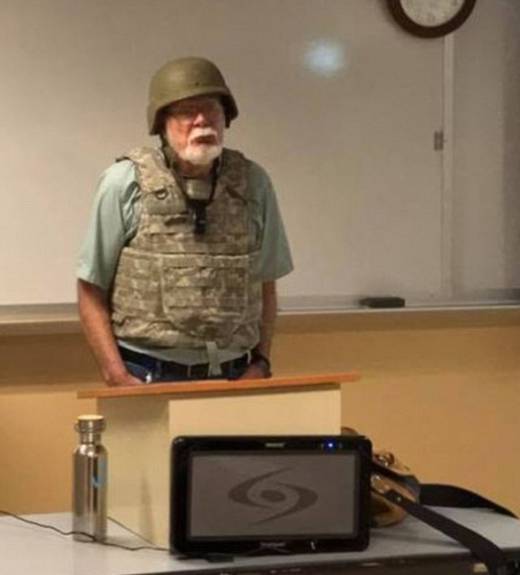 미국의 한 대학교수가 마치 군인처럼 방탄조끼와 방탄헬멧을 쓴 채 강단에 올라 논란의 중심에 섰다.