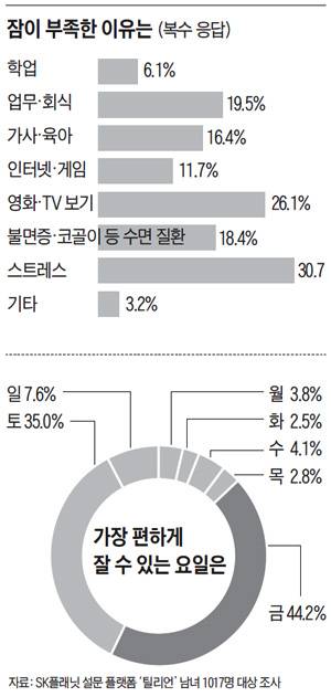 그렇다면 한국인은 왜 잠들지 못하고 있을까. friday 섹션이 '틸리언'과 함께 남녀 1017명에게 '잠 못 드는 이유'(복수 응답)를 물은 결과, '스트레스'(30.7%), '영화 및 TV 프로그램 시청'(26.1%), '과도한 업무 및 회식'(19.5%), '불면증, 코골이 등 수면 질환'(18.4%), '가사 및 육아'(16.4%), '인터넷 및 게임'(11.7%)이 꼽혔다. 스트레스나 처리해야 할 업무나 가사 때문에 어쩔 수 없이 잠을 줄이기도 하지만 '영화 및 TV 프로그램 시청'(26.1%), '인터넷 및 게임'(11.7%) 등 기분 전환 거리를 위해 잠을 포기하는 이도 많았다. 워킹맘 김주희(36)씨는 "일과 육아에 치이다 보면 잠들기 전 잠깐 누워 있는 시간 외에는 개인 시간이 없다"며 "보상심리로 새벽까지 스마트폰으로 인터넷을 뒤적인다"고 했다.