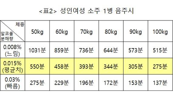 체중 70kg 성인 남성이 알코올 도수 19%의 소주 1병(360ml)을 마셨다고 가정해 계산해보았습니다. 알코올 분해가 느린 사람은 9시간 56분이 걸리는 반면 빠른 사람은 2시간 39분이 지나야 술에서 깨게 됩니다. 평균치(0.015%)로 계산했을 때 5시간 18분이 걸리는 것으로 나타났습니다.