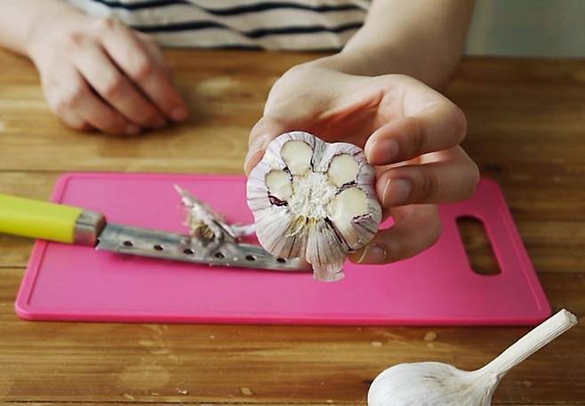 1. 마늘 뿌리 부분을 바짝 잘라 제거 한 후, 손으로 조각조각 뜯는다.