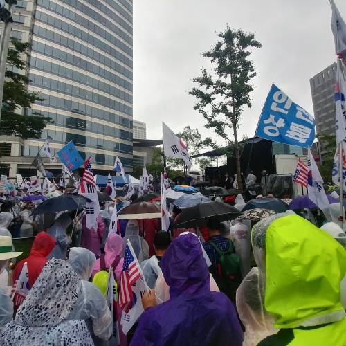 빗줄기가 쉴 새 없이 내리치는 궂은 날씨였음에도 하얀 우의를 입고 태극기와 성조기를 든 친박(친 박근혜 전 대통령)단체 회원 1000여명이 속속 모여들었다.