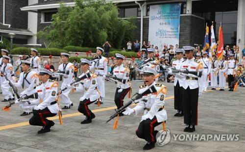 (제주=연합뉴스) 김호천 기자 = 15일 오후 제주 문예회관에서 제22회 제주국제관악제 참가팀들이 광복절 경축 퍼레이드를 하기 전 해군·해병 의장대가 공연하고 있다. 2017.8.15
