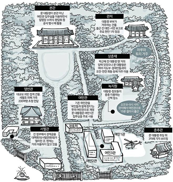 특별한 손님을 맞는 용도로 쓰이는 한옥 상춘재도 오랜만에 묵은 먼지를 털었다. 박근혜 전 대통령은 지난 1월1일 약식 기자간담회를 열어 억울함을 하소연할 때 빼곤 재임 기간 동안 한차례도 이곳을 이용하지 않았다. 반면 문 대통령은 여야 원내대표·당대표를 초청하거나 기업인들을 만날 때 상춘재 문을 열어 ‘협치의 상대방’을 예우하거나 정성을 표현하는 상징적 메시지를 던졌다.