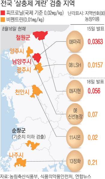 On August 16, the Ministry of Agriculture, Food and Rural Affairs announced that they detected Fipronil, an insecticide banned on chickens, in the eggs produced from an egg farm with 55,000 hens in Cheolwon after a preliminary inspection of 243 egg farms. In the case of the farm in Cheolwon, 0.056mg/kg of Fipronil was detected, much more than the international Codex standard (0.02mg/kg).