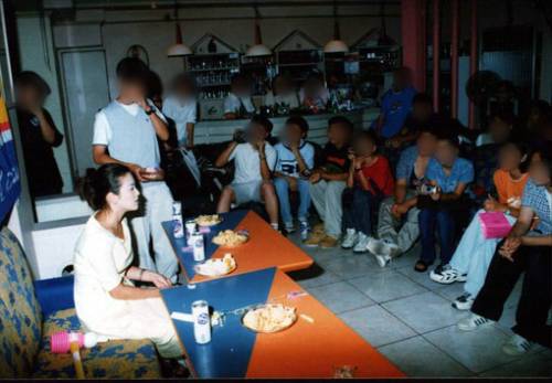 송혜교의 앞에 놓인 탁자에는 과자와 음료수 몇 캔만이 놓여 있다. 탁자를 사이에 두고 송혜교는 약 20여 명의 팬과 마주하고 있는 모습이다.
