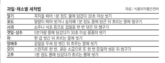 하지만 농산물별로 씻어 먹는 방법은 조금씩 다르다. 옥선명 여의도성모병원 가정의학과 교수는 “과일 채소는 물로 잘 씻어주기만 해도 잔류 농약을 대부분 제거할 수 있으나 농산물별 세척법을 알아두면 더 안전하게 섭취할 수 있다”고 말했다.