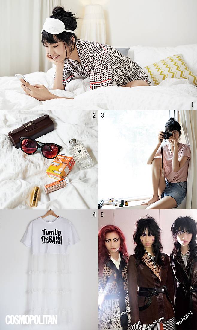 1 일어나자마자 인스타그램과 문자를 확인한다. 2 가방 속에 항상 가지고 다니는 선글라스와 향수, 그리고 비타민. 3 필름 속에 소소한 일상을 기록하는 편이다. 4 독특해 보여 구매했지만 도대체 어떻게 입어야 할지 난감! 5 루이 비통 쇼가 끝난 후 절친 정호연, 최소라와 함께.