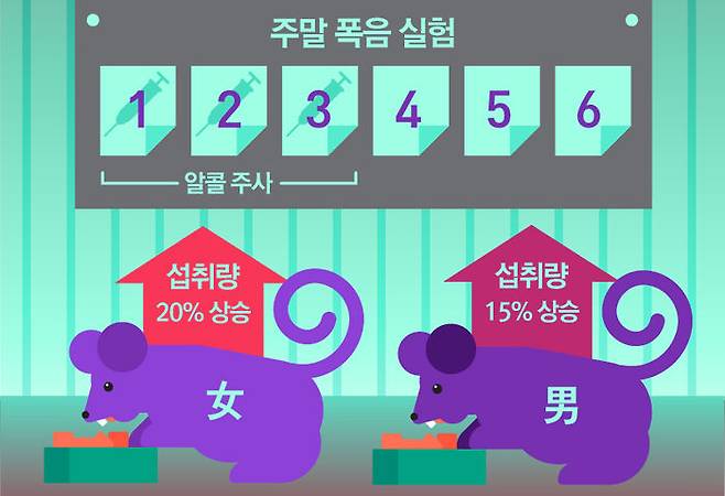 3일은 저녁마다 알코올을 주사하고 3일은 그냥 두는, 이른바 '주말 폭음 실험'이었습니다. 그런데 이를 반복한 결과 쥐가 알코올을 맞았을 때 먹이를 더 많이 먹는 것으로 나타났습니다. 양도 상당했는데요, 암컷 쥐의 경우엔 평소 먹는 양의 20%, 수컷 쥐는 15% 정도 섭취량이 증가한 겁니다.