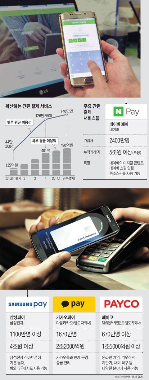 지난해 1분기 하루 평균 44만200여 건에 불과했던 간편 결제 건수는 올해 1분기 133만3200여 건으로 3배 이상 늘었다. 결제 액수의 증가폭은 더 커서 같은 기간 하루 평균 135억원에서 447억원으로 3.3배 늘었다. 시장 규모가 빠른 속도로 확대되고 있는 것이다. 한국은행은 "지난해 전체 가입자 수가 3200만명을 넘었고, 연간 거래액도 9조원 이상에 달했다"면서 "아직 신용·체크카드의 결제 규모(하루 2조원 이상)엔 못 미치지만, 주요 지급·결제 수단으로 자리 잡고 있다"고 밝혔다.
