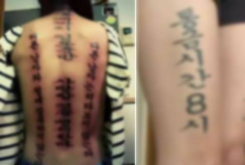 온몸을 뒤덮은 민망한 글씨 때문에 A씨는 민소매 의상이나 반바지도 못입고 꽁꽁 싸매고 다녀야만 했다.