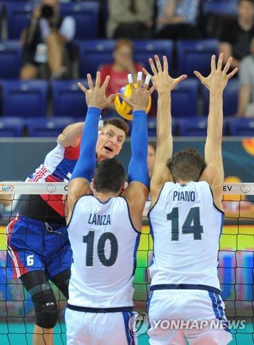 epa06169221 Michal Finger (L) of Czech Republic and Filippo Lanza (C) with Matteo Piano of Italy in action during the 2017 CEV Volleyball European Championship group B match between Czech Republic and Italy in Szczecin, Poland, 28 August 2017. EPA/MARCIN BIELECKI POLAND OUT