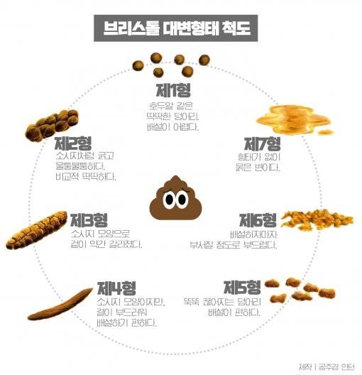 대변의 상태를 말로 설명하는 건 쉽지 않습니다. 이럴 땐 ‘브리스톨 대변형태 척도(Bristol Stool Chart)’가 도움이 됩니다. 영국 브리스톨대 케네스 히튼 박사가 고안한 척도인데요. ‘변은 장 안에 오래 있을수록 단단해진다’는 점을 고려해 변의 굳기와 형태에 따라 7가지 형태로 구분해 1997년 ‘스칸디나비아 위장병학 저널’에 발표했습니다.