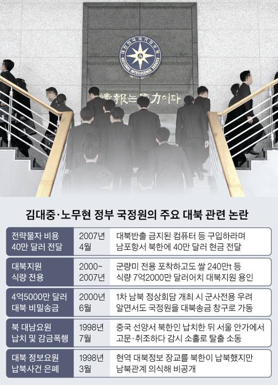 대한민국 국가 정보기관으로서의 국정원 위상을 바닥까지 실추시킨 건 대북 비밀송금 파문이다. 2000년 6월 김대중 대통령과 김정일 국방위원장 간의 첫 남북 정상회담 개최 과정에서 북한 측에 4억5000만 달러(약 5067억원)의 천문학적인 돈을 몰래 보냈는데, 국정원이 핵심 역할을 한 것이다. 이 과정에서 국정원은 자금의 불법 환전소 역할을 했고, 정보요원 개인의 계좌까지 동원했다. 대북송금 특검에서 국정원 고위 간부는 “북측이 군사비로 전용할 우려가 있다는 문제를 알고 있었다”는 증언을 해 국민에게 충격을 안겼다. 그런데도 국정원은 의혹이 제기될 때마다 “그런 일을 할 수 있는 방법이 없다”며 국민을 기만하거나 언론에 책임을 돌렸다.