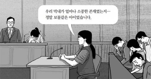 "우리 막내가 얼마나 소중한 존재였는지 피고인이 알았으면 합니다. 그 아이는 정말 보물 같은 아이였습니다. 그날 누구라도 그 자리에 있었더라면 같은 일을 당했을 겁니다. 자기가 무슨 잘못을 한 건지 제대로 알길 바랐습니다. 피고인이 자신에게 맞는 벌을 받았으면 좋겠습니다."