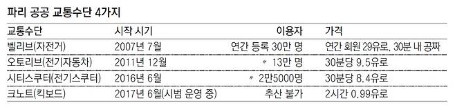 파리에서 공공 교통수단들이 성공한 비결은 저렴한 가격과 편리성에 있다. 벨리브는 연간 29유로(약 3만9000원)만 내면 30분 이내 운행은 1년 내내 공짜다. 오토리브도 30분당 9.5유로(약 1만2900원)로 택시보다 훨씬 싸다. 게다가 파리 시내에 벨리브 주차장이 1260곳, 오토리브 주차장은 1100곳이 마련돼 있다. 평균적으로 시내 어디서나 300m마다 주차장이 있는 셈이라 편하게 주차할 수 있다. 게다가 교통카드 한 장으로 지하철과 버스는 물론이고 이들 공공 교통수단도 함께 이용할 수 있어 편리하다.