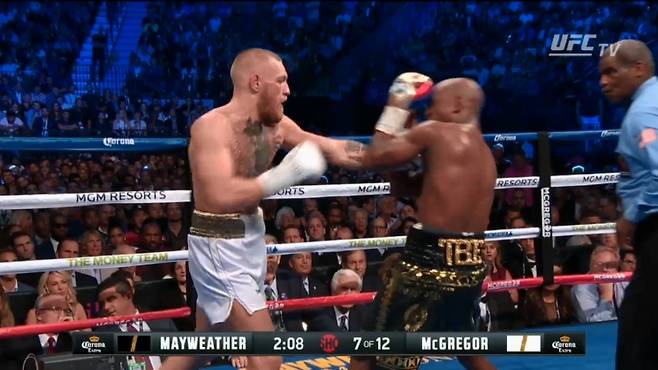 하지만 이 장면들 외에는 맥그리거가 경기 중 클린치에서 메이웨더를 괴롭히는 모습을 특별히 찾아 볼 수 없었습니다. 물론 영리한 메이웨더가 평소에 비해 종합격투가인 맥그리거와 클린치 싸움을 정면으로 하지 않은 이유도 있지만, 이번 경기를 해설하며 또 하나 확실히 느낀 건 맥그리거는 생각보다 레슬링의 손싸움이 강하지 않다는 점이었습니다.