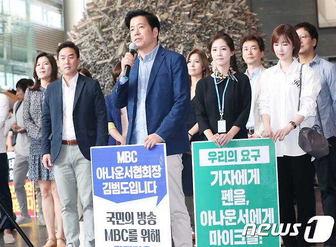 (서울=뉴스1) 권현진 기자 = 김범도 MBC 아나운서협회장(왼쪽 세번째)이 31일 서울 마포구 상암동 MBC에서 김장겸 사장, 고영주 방송문화진흥회 이사장 퇴진을 촉구하고 있다. 2017.8.31/뉴스