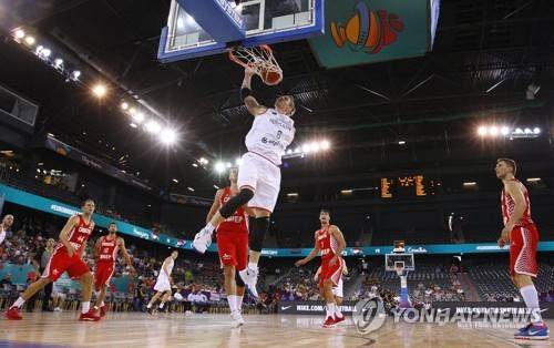 epa06176839 Hungary's Akos Keller dunks the ball in during the EuroBasket 2017 group C match between Hungary and Croatia, in Cluj Napoca, Romania, 01 September 2017. EPA/ROBERT GHEMENT