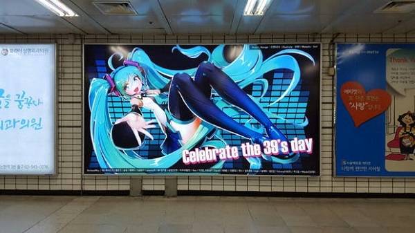 | ▲ 미쿠 팬들이 모여 2016년 3월 9일 사당역에 미쿠 9주년 광고를 걸었다. |
