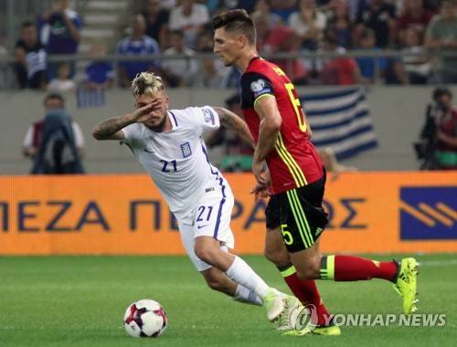epa06181809 Greece's Kostas Stafylidis (L) vies for the ball with Belgium’s Thomas Meunier during the qualifying Round 1 Group H soccer match for the FIFA World Cup, in Athens, Greece, 03 September 2017. EPA/PANAGIOTIS MOSCHANDREOU