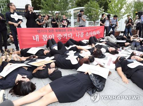 (서울=연합뉴스) 김현태 기자 = 5일 오전 서울 종로구 정부서울청사 앞에서 여성환경연대 회원들이 정부에 생리대 모든 유해성분 규명 및 역학조사를 촉구하는 '내 몸이 증거다, 나를 조사하라'는 기자회견을 하며 퍼포먼스를 하고 있다. 2017.9.5