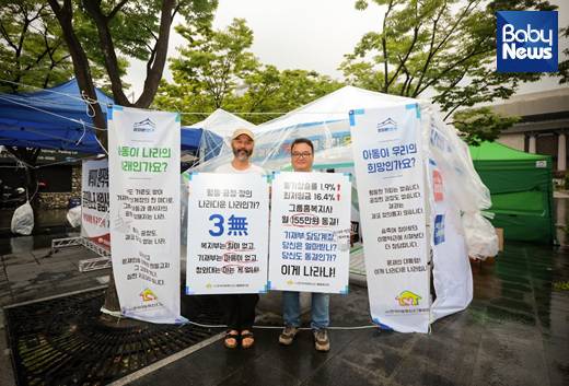 6일 오후 안정선 (사)한국아동청소년그룹홈협의회 회장(좌)과 집행부는 서울시 종로구 세종로공원에 위치한 광화문 1번지에서 비를 맞으며 피켓시위를 하고 있다. 최대성 기자 ⓒ베이비뉴스 |