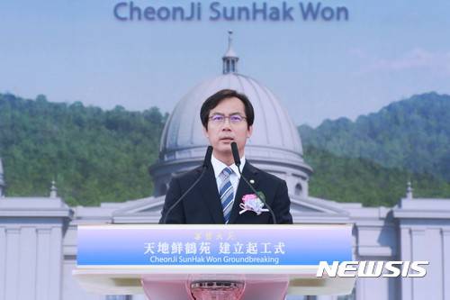 【서울=뉴시스】 8일 경기도 가평군 설악면에서 열린 '천지선학원 건립기공식'에 참석한 김영우 국회 국방위원장이 축사를 하고 있다. 2017.09.08. (사진=세계평화통일가정연합 제공)