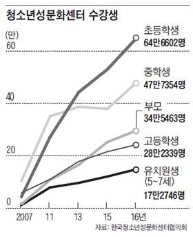 자녀들이 언젠가 음란물에 노출될 수밖에 없으니 어릴 때부터 제대로 성교육을 시키는 게 낫다는 부모도 늘고 있다. 요즘 여성가족부가 운영하는 전국 58개 성교육센터에는 학부모들로부터 "우리 아이도 성교육을 해달라" "아이들에게 올바른 성교육을 할 수 있도록 방법을 가르쳐 달라"는 문의 전화가 잇따른다. 아빠들이 직접 자녀의 성교육 프로그램을 신청하기도 한다. '성교육 하는 아빠'란 블로그를 운영하는 성교육 강사 박제균(45)씨는 "부모 요청에 따라 4~5명 학생을 모아 소규모 성교육 과외를 진행하는데 여름 성수기 때는 한 달에 20건 이상 문의가 온다. 10월까지 강연 일정이 가득 찼다"고 말했다.
