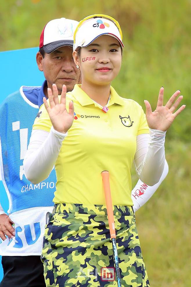 [이데일리 골프in=가평, 박태성기자] 10일 경기도 가평에 위치한 가평 베네스트 골프클럽(파72ㅣ6,538야드)에서 2017 KLPGA 투어 시즌 스물세 번째 대회이자 하반기 세 번째 메이저 대회인 '이수그룹 제39회 KLPGA챔피언십(총상금 8억 원, 우승상금 1억 6천만 원)' 최종라운드가 열린 가운데, 장은수(19.CJ오쇼핑)가 1번홀 티샷 전 반가운 손 인사를 하고 있다.