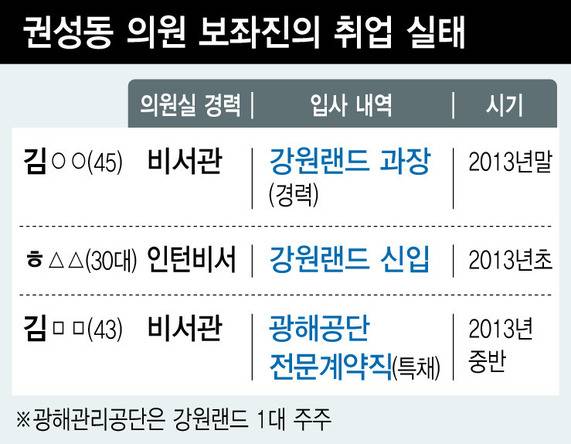 ㅎ씨와 함께 권 의원 지역사무실에서 일하던 김아무개 비서관은 교육생 채용 뒤인 2013년말 자격미달인데도 불구하고 강원랜드 경력직(과장)에 부정채용된 바 있다.(▶관련기사 : 권성동 의원 비서관, 강원랜드 부정 입사)