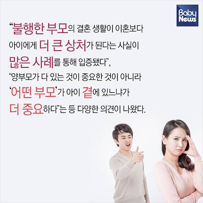 4. "불행한 부모의 결혼 생활이 이혼보다 아이에게 더 큰 상처가 된다는 사실이 많은 사례를 통해 입증됐다", "양부모가 다 있는 것이 중요한 것이 아니라 '어떤 부모'가 아이 곁에 있느냐가 더 중요하다"는 등 다양한 의견이 나왔다.