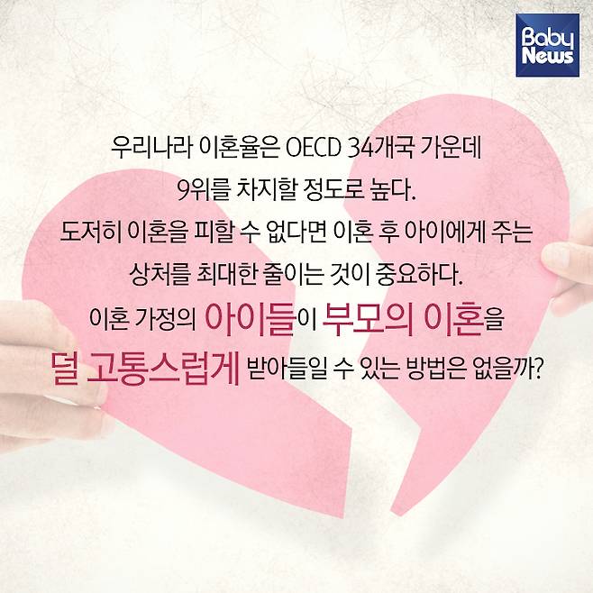 2. 우리나라 이혼율은 OECD 34개국 가운데 9위를 차지할 정도로 높다. 도저히 이혼을 피할 수 없다면 이혼 후 아이에게 주는 상처를 최대한 줄이는 것이 중요하다. 이혼 가정의 아이들이 부모의 이혼을 덜 고통스럽게 받아들일 수 있는 방법은 없을까?