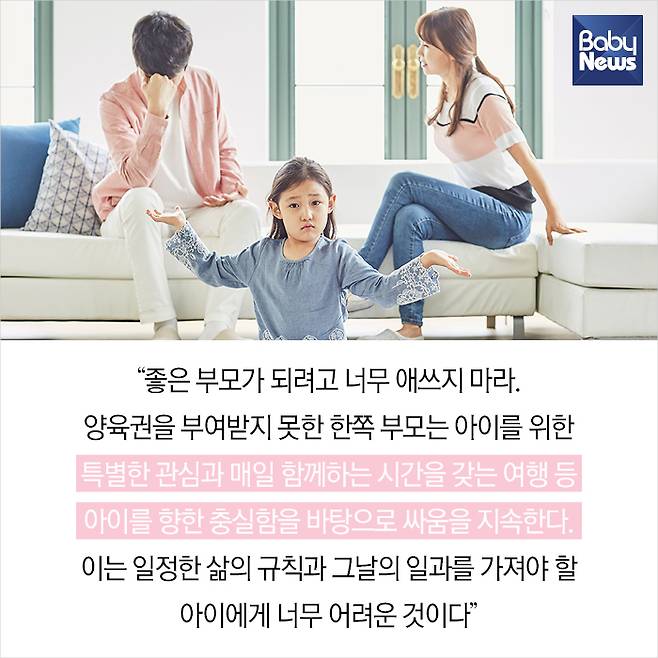 9. “좋은 부모가 되려고 너무 애쓰지 마라. 양육권을 부여받지 못한 한쪽 부모는 아이를 위한 특별한 관심과 매일 함께하는 시간을 갖는 여행 등 아이를 향한 충실함을 바탕으로 싸움을 지속한다. 이는 일정한 삶의 규칙과 그날의 일과를 가져야 할 아이에게 너무 어려운 것이다.”