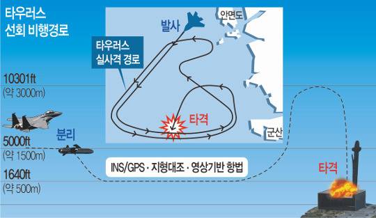 충남 태안반도 인근 서해 상공의 F-15K 전투기에서 발사된 타우러스는 자체 항법 선회비행을 통해 약 400㎞를 날아가 전북 군산 앞바다의 직도사격장에 설치된 표적을 정확하게 타격했다.
