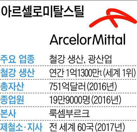 아르셀로미탈은 4개 대륙 27개국에 제철소를 둔 글로벌 기업이다. 세계 최대 철강왕인 인도인 미탈 회장이 2006년 유럽계 아르셀로스틸을 인수합병해 세운 회사이다. 당시 세계 1위 철강기업이었던 미탈은 세계 2위 아르셀로를 사들여 경쟁기업이 넘볼 수 없는 거대 철강기업을 탄생시켰다. 인수 금액은 395억달러(약 45조원)에 달했고 자문사 골드만삭스는 자문료로만 1억9000만달러를 챙겼다. 아르셀로미탈의 연간 철강생산 능력은 2007년 말 기준 1억2000만t으로 2위인 일본 신일본제철의 3270만t보다 3배 이상 많다.